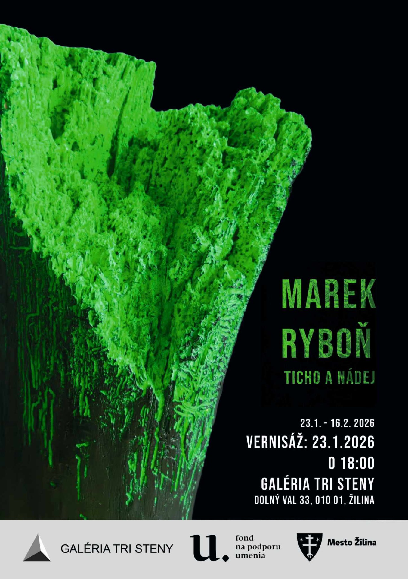 Pozývame vás na vernisáž profesionálneho žilinského sochára Mareka Ryboňa, ktorý nám predstaví svoju najnovšiu tvorbu na výstave Ticho a nádej dňa 23. 1. 2026 o 18:00hod . Budete mať možnosť vidieť precízny výber diel a ich site-specific inštaláciu v priestoroch Galérie Tri steny, Dolný Val 33, 010 01 Žilina. Už teraz sa veľmi tešíme a sme poctení, že práve umelec Marek Ryboň otvorí prvú výstavu Galérie Tri steny v roku 2026. Nenechajte si ujsť tento vizuálny zážitok a tešíme sa na vás.