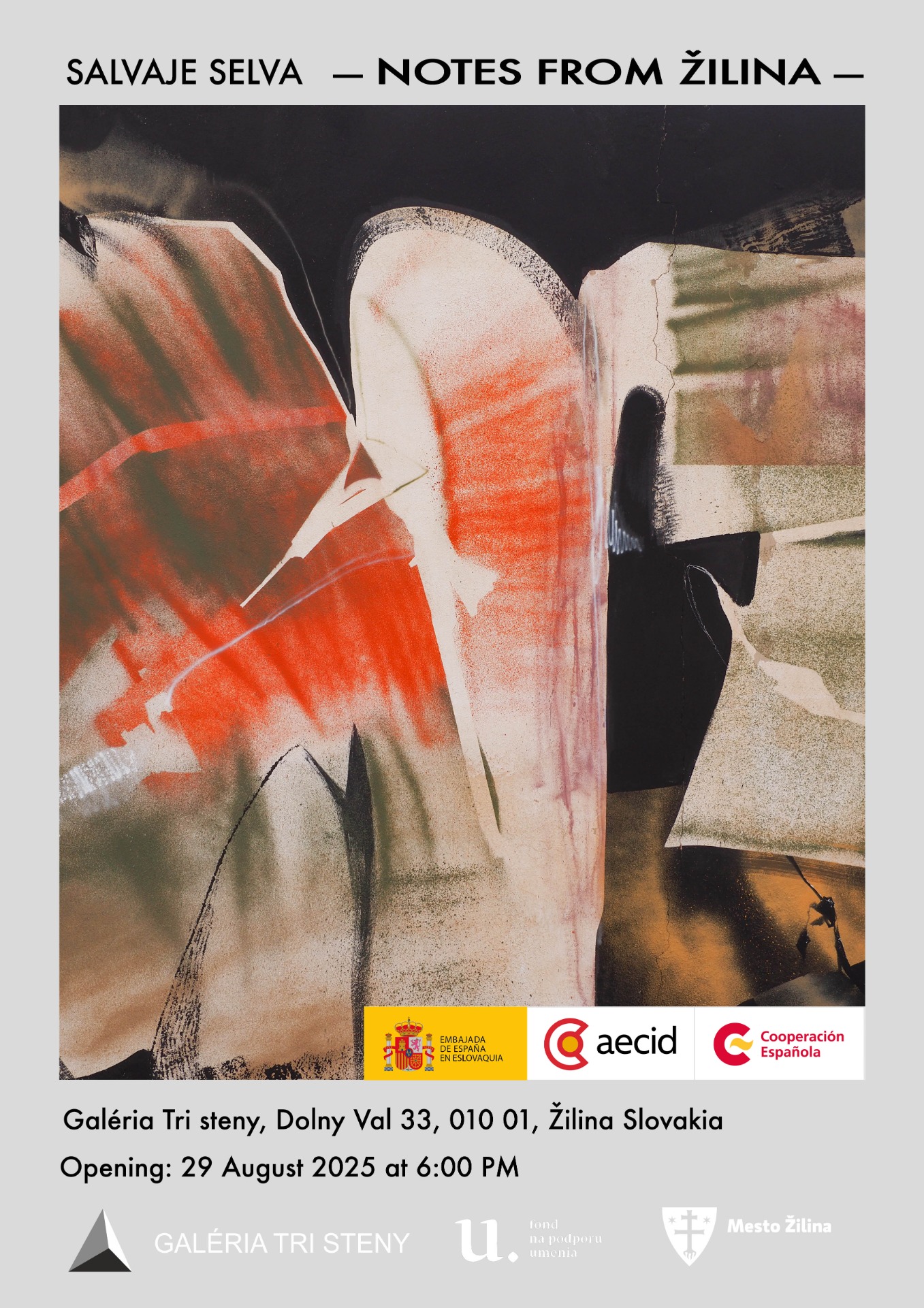 Predstavujeme vám výstavu s názvom NOTES FROM ŽILINA od španielskeho umelca Salvaje Selva – menom Jorge Ortuño, ktorý tvorí diela v štýle abstraktného post-graffiti, kde reflektuje vnímanie slovenskej republiky, ovplyvneného novou kultúrou a neznámou krajinou v sérii diel vytvorených priamo v galérii Tri steny v Žiline. Zo svojich skúseností s experimentálnou tvorbou, primárne technikou spreja, ktorá poháňa jeho kreativitu, chce vypovedať o tom, ako vníma zážitky a dojmy z pobytu a prebádania charakteristických vlastností slovenského národa. Táto kolekcia bude priamo zakomponovaná a prispôsobená priestorom galérie a stane sa vizuálnou odpoveďou na miestnu krajinu, formou abstraktnej maľby. Pri bližšom pohľade na obrazy v nich nachádzame rytmus sprejových ťahov, používanie prírodných materiálov, kombinácie chromatických farebných harmónií ako vnútorné reflexie inšpirované prostredím, ktorá umecla obkolopuje a dynamickú hru línií prostredníctvom ich vrstvenia. V tvorbe sa usiluje o hľadanie rovnováhy medzi štruktúrami, pozadím a farbou. Prepojenie medzi dielom a prostredím, či už mestským, alebo prírodou, súčastnou dobou, alebo históriou zanecháva vizuálny zážitok rezonujúci s umelcovou predstavivosťou. Veríme, že výstava prinesie slovenskému publiku nezvyčajný pohľad na súčasné španielske umenie a obohatí domácu umeleckú scénu o nové inšpirácie.