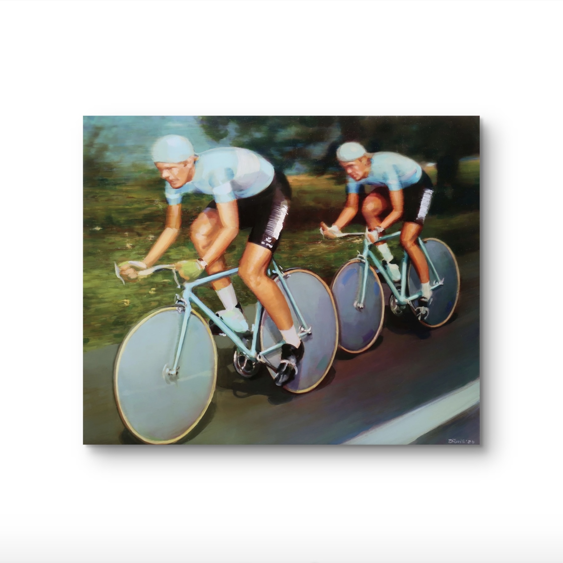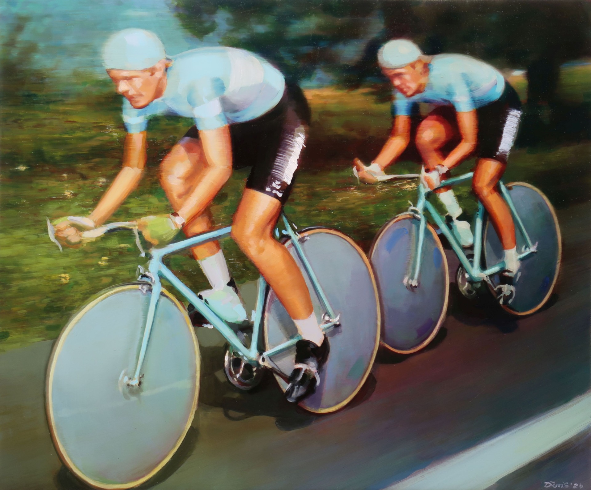 "Moje obrazy sú satirická propaganda ľudstva, ktoré odmieta akékoľvek pochybnosti o zmysle a cieli závodu."— Juraj ĎurišJuraj Ďuriš (1992, Nitra; žije v Prahe) je absolventom Fakulty výtvarných umení v Brne a magisterského štúdia na Vysokej škole výtvarných umení v Bratislave v ateliéri Ivana Csudaia.V roku 2023 absolvoval prestížnu stáž na Cité internationale des arts v Paríži a jeho veľkoformátové murály nájdeme naprieč Európou i v Maroku. Vo svojich dielach spája svet športu a moreplavby – cyklistov, hokejistov či pilotov F1 zobrazuje spolu s monumentálnymi tankermi a loďami, ktoré sa stávajú symbolmi moci, súťaženia i ľudskej márnivosti. S iróniou využíva vizuálny jazyk propagandy a reklamy, aby odhalil, kam až siaha naša túžba po víťazstve a technickej dokonalosti.