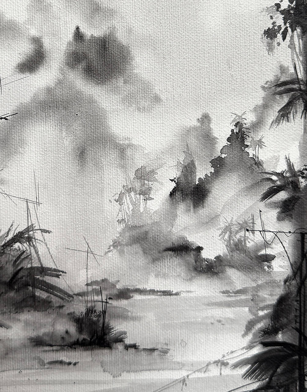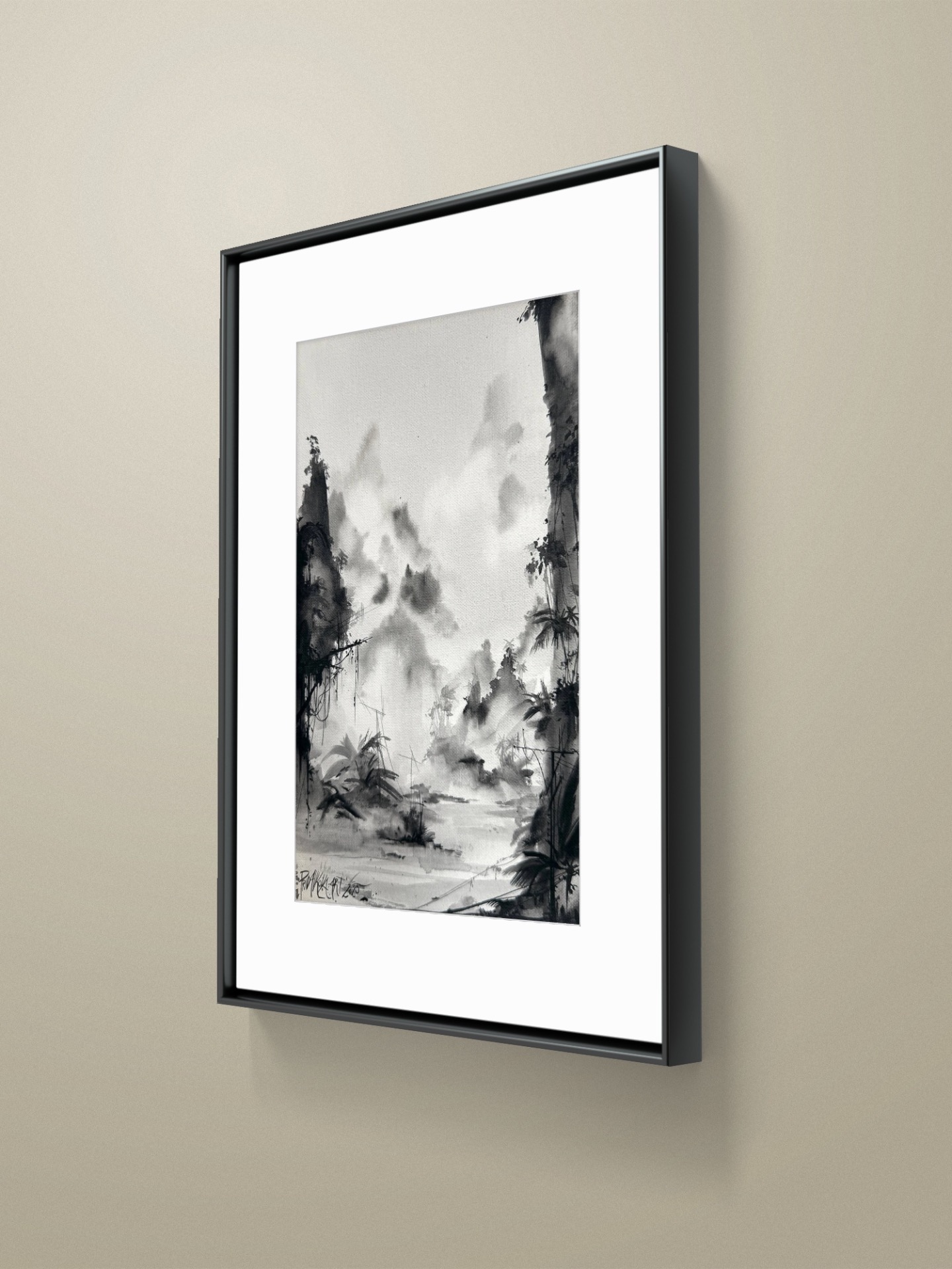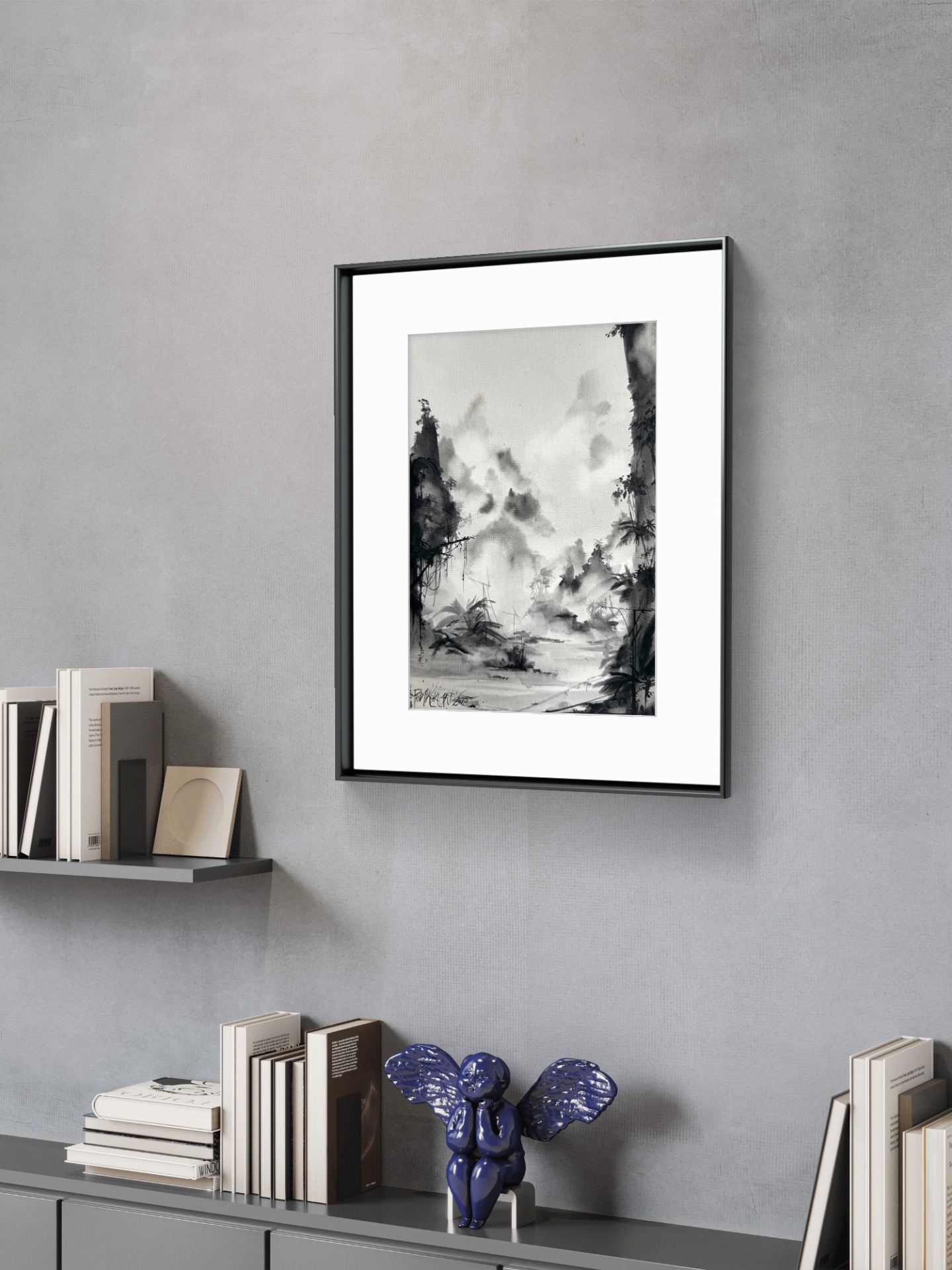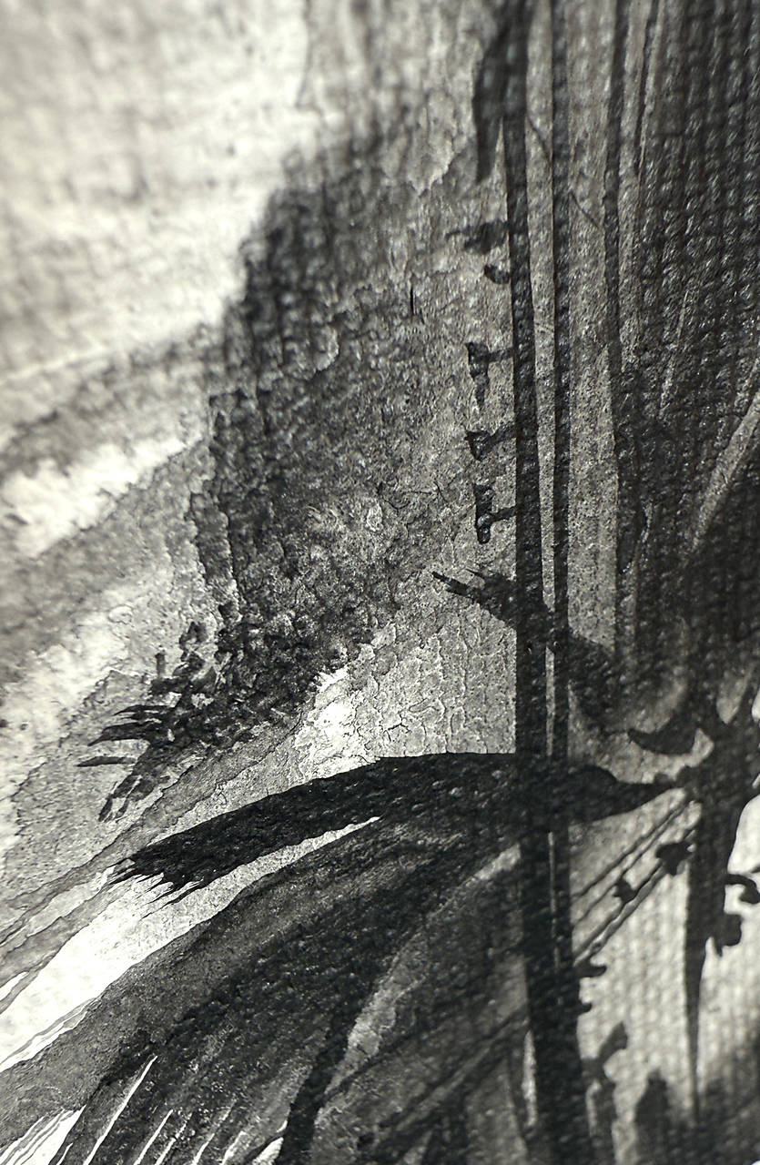 Táto najnovšia maľba na plátne z čerstvej série prináša atmosféru ďalekého východu v jemne našedlej, vzdušnej palete. Hoci pôsobí ľahko, vťahuje do seba tichom a hĺbkou – kontrast čiernej a bielej ťa pozýva priblížiť sa a objaviť drobné detaily ukryté v spleti stromov, listov, stĺpov a káblov.