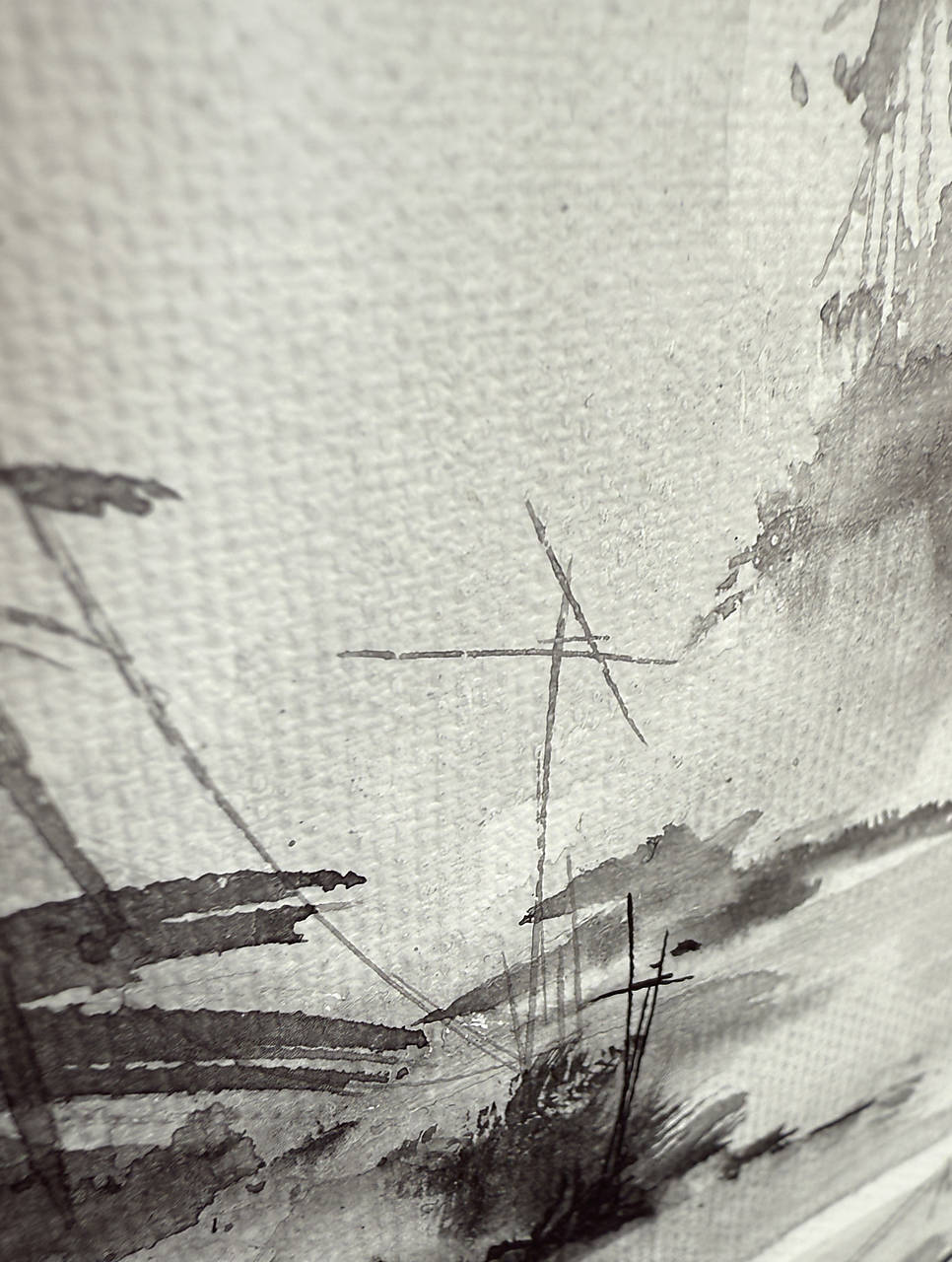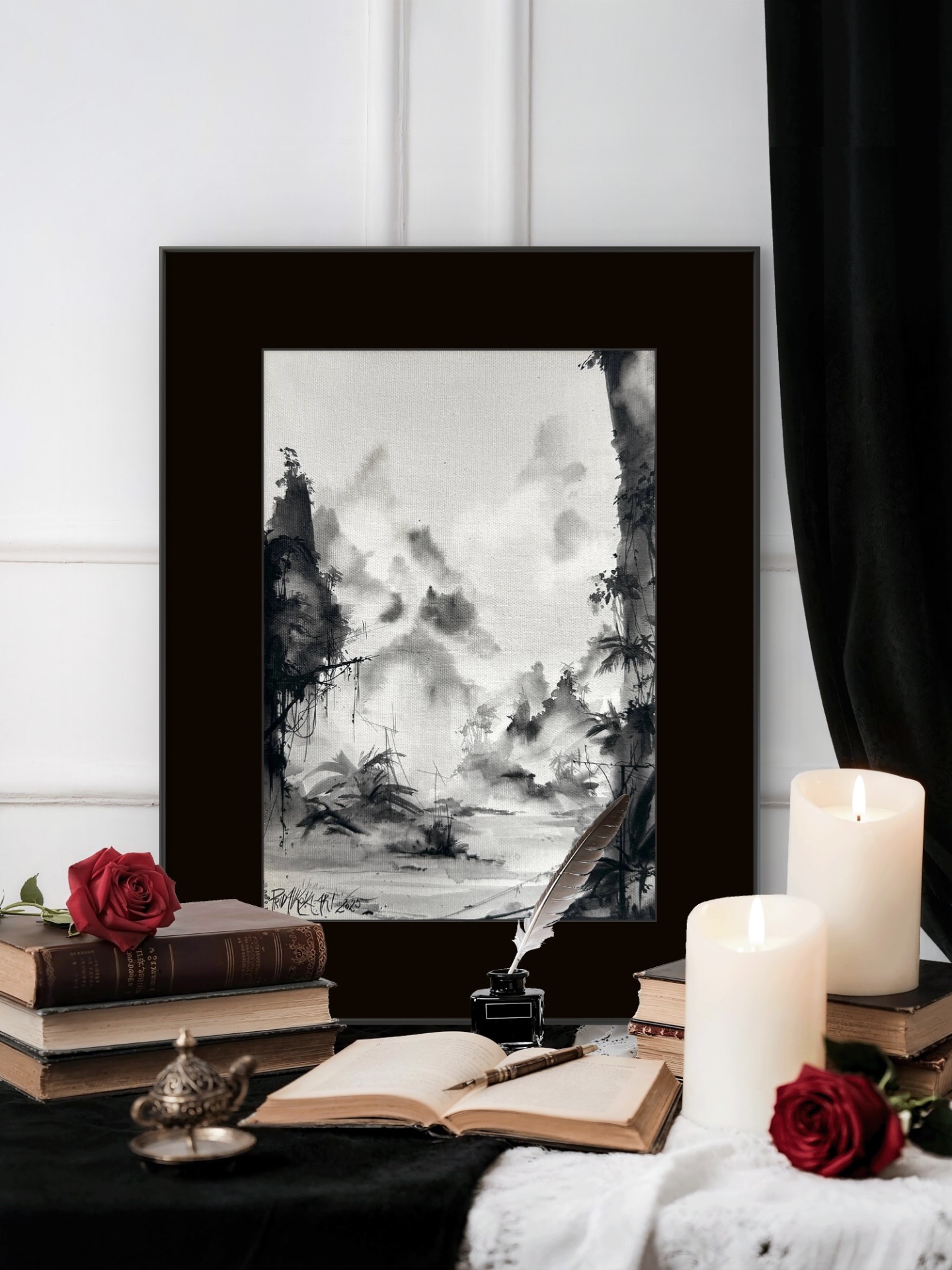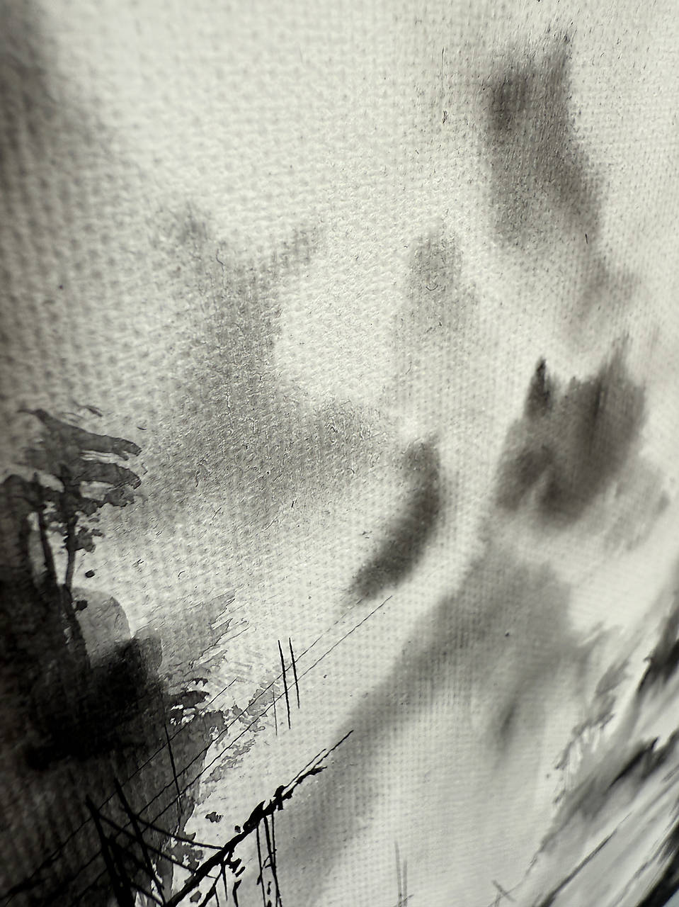 Táto najnovšia maľba na plátne z čerstvej série prináša atmosféru ďalekého východu v jemne našedlej, vzdušnej palete. Hoci pôsobí ľahko, vťahuje do seba tichom a hĺbkou – kontrast čiernej a bielej ťa pozýva priblížiť sa a objaviť drobné detaily ukryté v spleti stromov, listov, stĺpov a káblov.