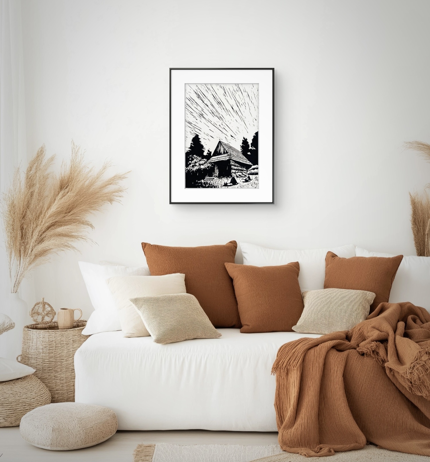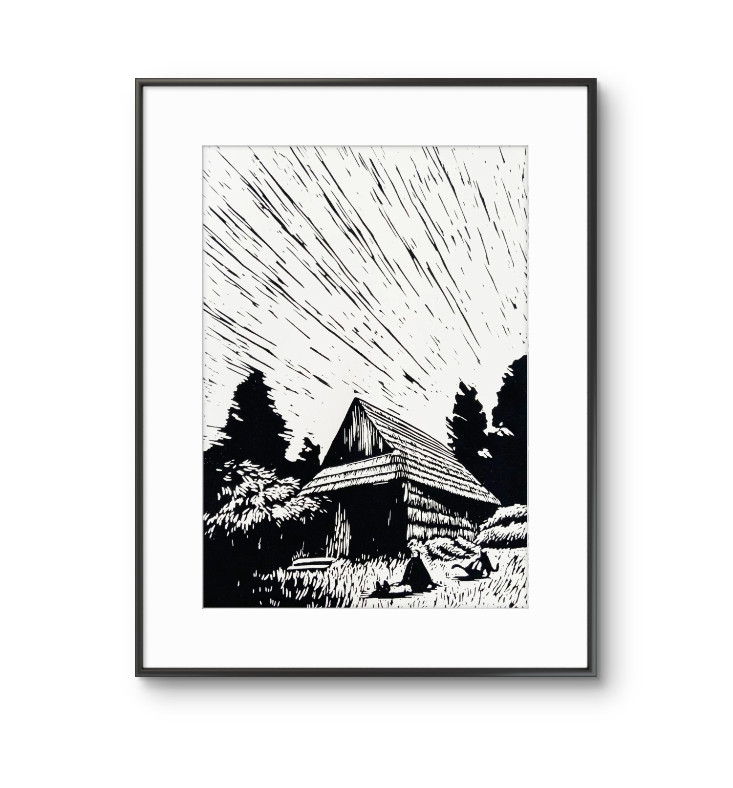 Technika: linoryt tlačený na béžovom grafickom papieri vyššej gramáže so štruktúrou